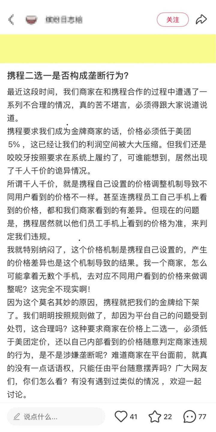 在消费调解平台黑猫投诉上,有携程特牌商家表示,其严格遵守不与美团合作的约定,但携程通过钓鱼测试,订单在酒店商户并不知晓的情况下经倒卖由飞猪卖出,最终被携程处以“限流15天”的处罚;在小红书上,也有商家表示成为携程金牌需承诺价格低于美团5%;今年6月,更是有酒店商家集体公开爆料,称携程平台在未与酒店沟通的情况下,通过“调价助手”工具擅自修改了他们在平台上所设置的房价。